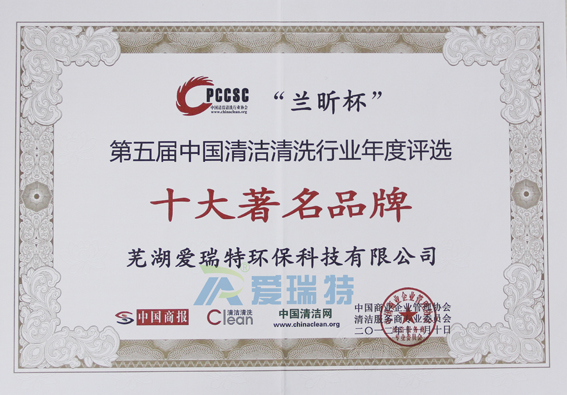 金秋颯爽,碩果累累,由中國(guó)商報(bào)、中國(guó)清潔網(wǎng)、中國(guó)商業(yè)企業(yè)管理協(xié)會(huì)、清潔服務(wù)商專業(yè)委員會(huì)舉行的“蘭昕懷”第五屆中國(guó)清潔清洗行業(yè)年度評(píng)選活動(dòng)中,蕪湖愛瑞特環(huán)??萍加邢薰颈辉u(píng)為“十大著名品.