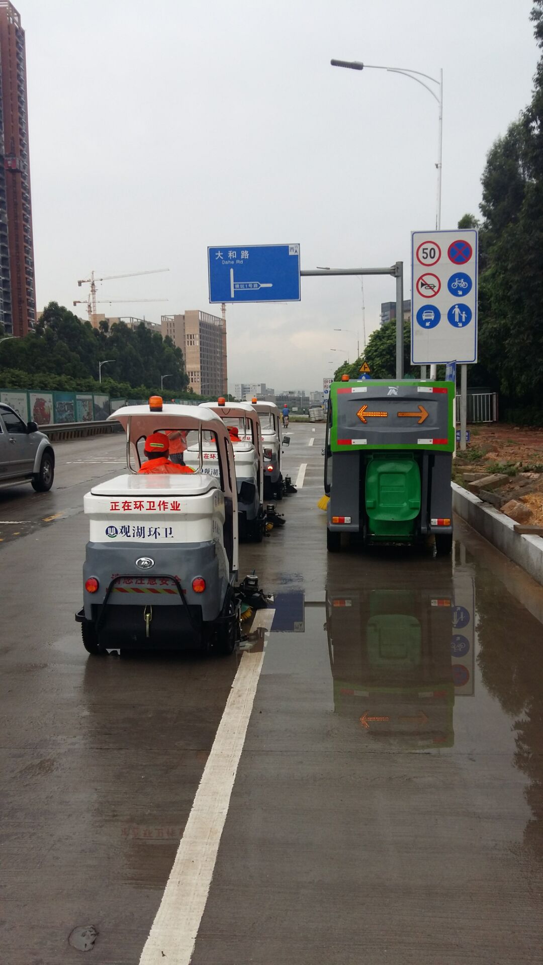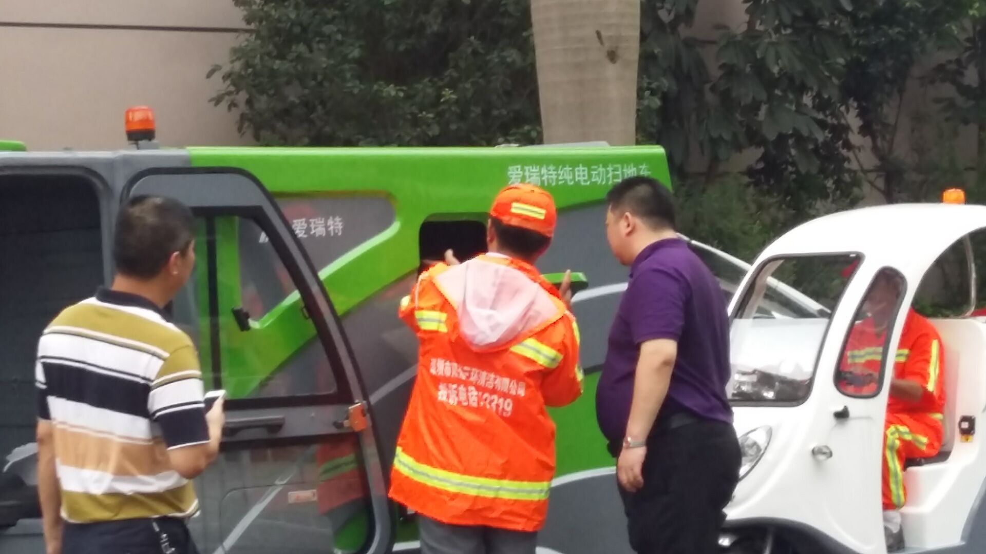 愛瑞特及龍華辦事處工作人員接到通知后,準(zhǔn)備了一場特別的歡迎儀式。到達(dá)調(diào)研現(xiàn)場,迎面看到的是“愛瑞特儀仗隊”整齊劃一地停在馬路邊,等待領(lǐng)導(dǎo)的視察檢閱,成為觀湖街道上一道特別的風(fēng)景線。龍華新區(qū)辦事處工作人員向相關(guān)領(lǐng)導(dǎo)系統(tǒng)詳細(xì)地匯報了環(huán)衛(wèi)項目的進(jìn)展和后續(xù)規(guī)劃,并讓環(huán)衛(wèi)工作人員現(xiàn)場演示清掃過程。
