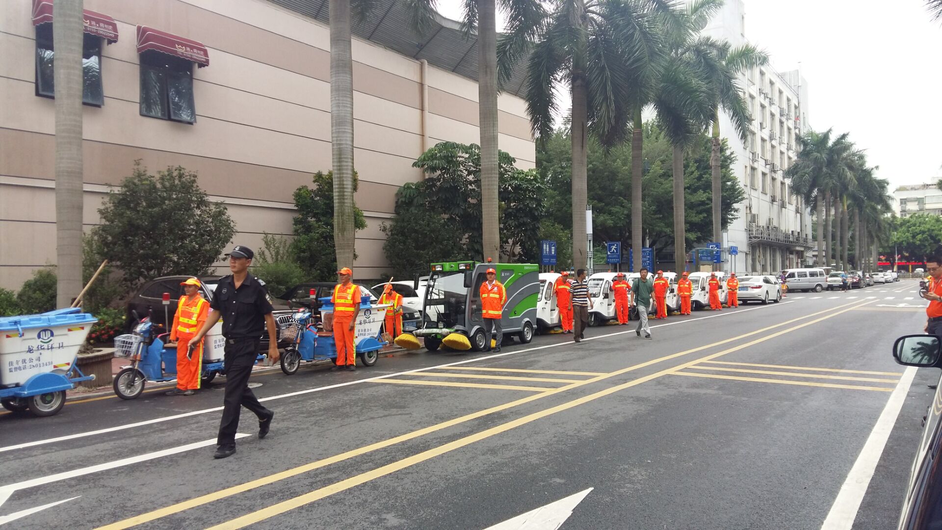 愛瑞特及龍華辦事處工作人員接到通知后,準(zhǔn)備了一場特別的歡迎儀式。到達(dá)調(diào)研現(xiàn)場,迎面看到的是“愛瑞特儀仗隊”整齊劃一地停在馬路邊,等待領(lǐng)導(dǎo)的視察檢閱,成為觀湖街道上一道特別的風(fēng)景線。龍華新區(qū)辦事處工作人員向相關(guān)領(lǐng)導(dǎo)系統(tǒng)詳細(xì)地匯報了環(huán)衛(wèi)項目的進(jìn)展和后續(xù)規(guī)劃,并讓環(huán)衛(wèi)工作人員現(xiàn)場演示清掃過程。